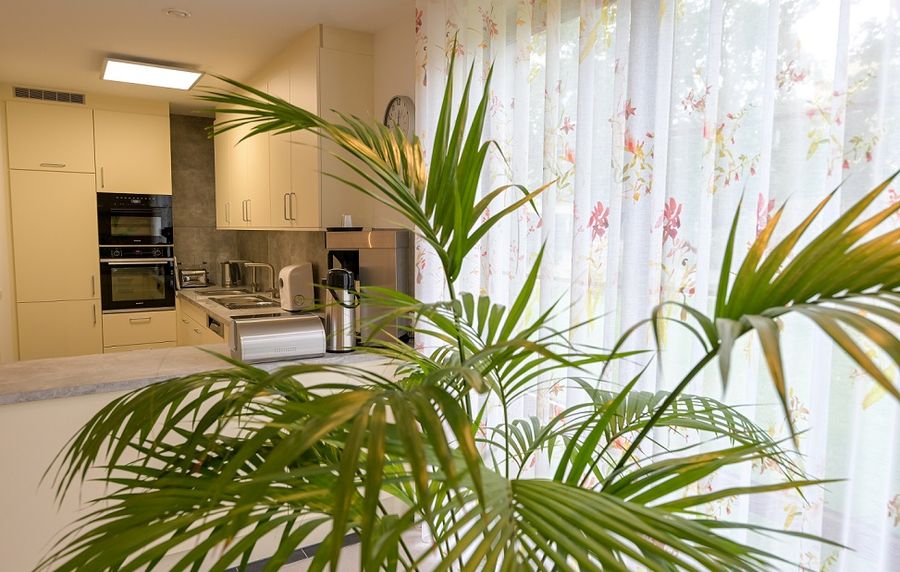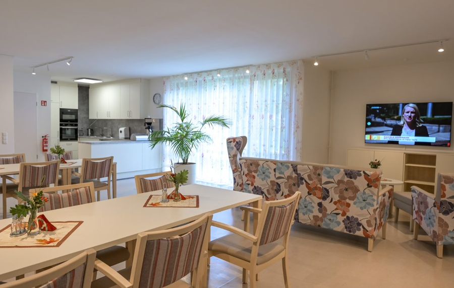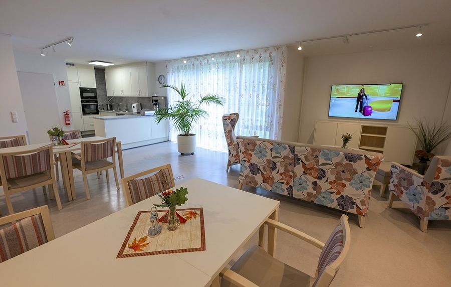 Auf jedem der vier Wohnbereiche der Pflegeeinrichtung befindet sich ein wohnlich eingerichteter Aufenthaltsbereich. Hier können Sie Ihre Mahlzeiten einnehmen, falls Sie einmal nicht in der Cafeteria essen möchten. In vertrauter Atmosphäre können Sie hier gemeinsam mit den anderen Bewohnerinnen und Bewohnern Ihres Wohnbereichs essen und sich zwischen den Mahlzeiten aufhalten.